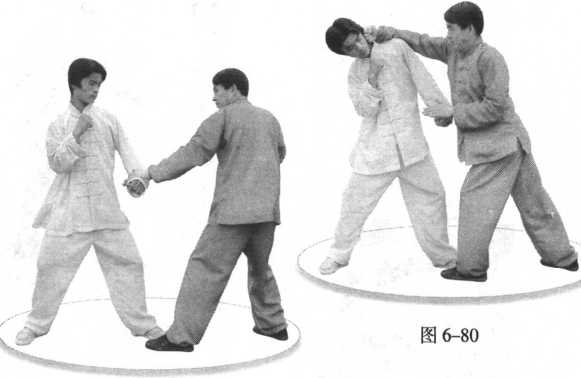 (2) 我先用左掌向 下拍敌前臂,扒开敌上 门。(图 6-79)