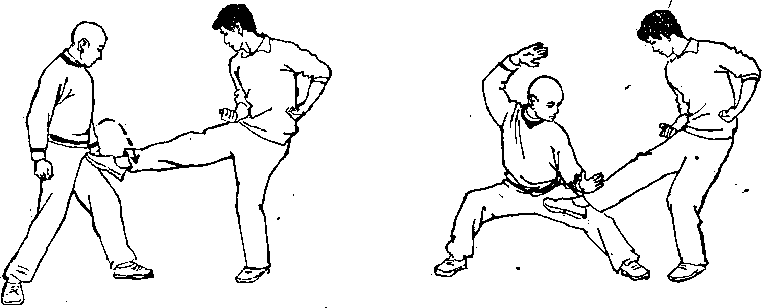 乙方在甲方左脚在前?右脚在后站立的情况下用右脚踢击甲方裆部或小腹(图17)