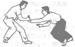 上动不停甲左脚朝前半步脚尖内扣全脚着地右脚蹬地跟进两腿屈膝下蹲成左四六步。上步同时左臂内旋逆时针绕环当绕至腹前时左手五指并紧指尖用力快速剌戳乙裆部外生殖器指尖朝前掌心朝下右臂外旋右拿回收至左肘关节上侧指尖朝上掌心朝左欲朝前击打目视乙胸下侧。乙见甲来势快捷迅猛快速朝前俯身左、右脚相继后退一步成左六四步退步同时两臂内旋两掌同时朝前下拍打甲左小臂而后沉肩坠肘使两掌朝前上方推瓶或用指尖插其眼目视前下方