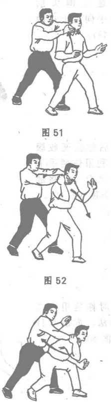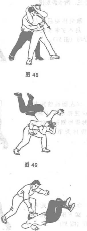 敌由你背后用双臂抱住你腰时敌拦腰后拉并用下腭压你右肩时(图47)你速左偏头后仰两手向后上抓敌头(48)然后你快速收腹弯腰利用你两手下压前拉之合力将敌摔过你头顶(图49)此时你速用右二指插掌法向敌双目点插(图50)