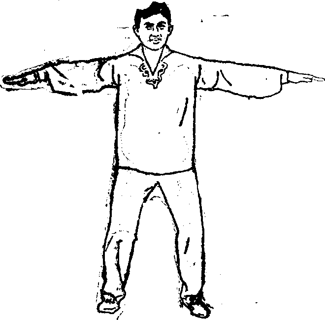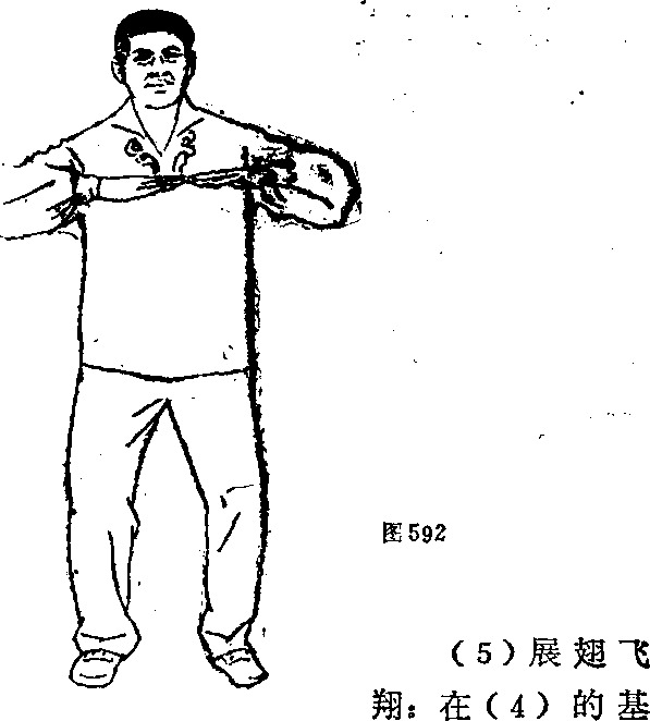础上头颈、胸、腹、腿、脚仍然不动将胸前之两臂分开转向两例,两掌两臂平肩掌心向下(图593)