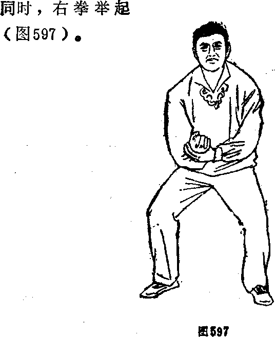 当喊嘿字时左脚蹬地右拳抡在胸前打在左掌心上(图598)。