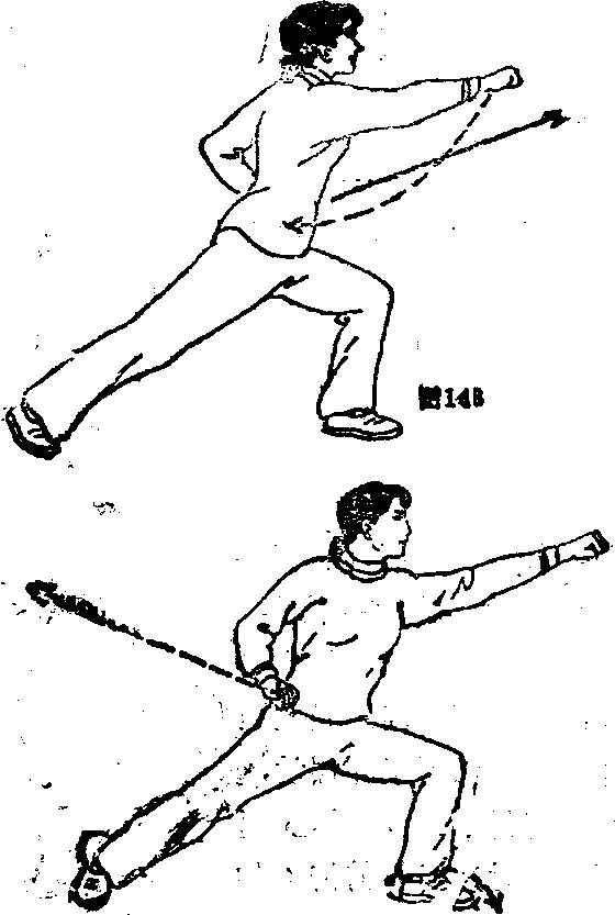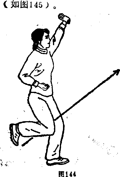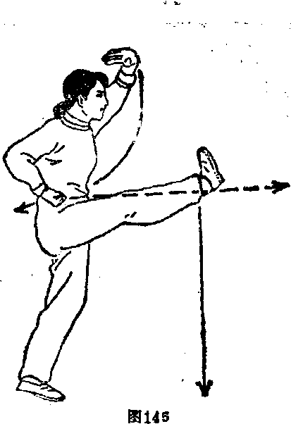 1右掌变拳由左掌上面抽回屈肘放跑吁后腰侧攀心朝上左掌则有右拳抽画阴洞时右臂下面向前向上屈肘架起位于额前上方熹揩朝右掌心扁箭与住同时右脚离地在身后屈膝提起眼视前方(如图144)
