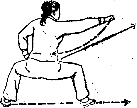 ()硬拉弓马步侧击右仙向前跨身躯左转向北左脚跟里转两腿屈膝半跨成马步同时左掌从身前落下变拳屈肘收抱于左腰侧拳心朝上右拳即向右侧直臂平伸冲击拳心朝下,眼视右拳前方(如图146)。