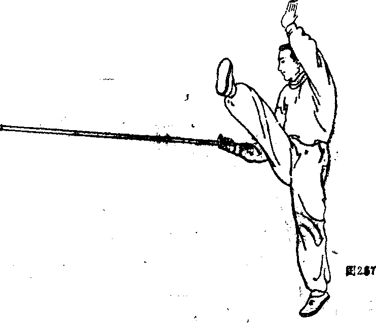 上左步身体右转穿把。接上动作共右转三圈共上六步。三十五)金枪喉身体左转左弓步,枪尖对喉部(如图2, 接上动作9重心后移枪尖接近喉部接上动作身体右转左腿向右上步,(三十入8门三枪左弓步3跄(如图256)。1 1-,枪穿出收于腰间图考66图考66图考66图考66接上动恬拿枪接上动作右手向前比格。(三十七)张飞骗马双手撤如瘠艇迈枪里合右手接枪(如图25)6
