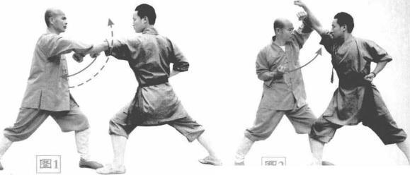 (1)对方以饿虎扑食之势向前出双拳欲击打我头部两侧太阳穴我身体腾空两臂向上插入他两臂间格挡。(图1)