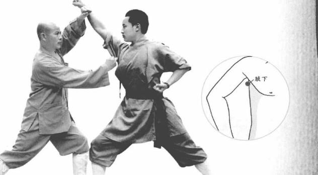 (3)然后重心迅速前移右拳变凤点拳向前向上点击对方腋下穴。(图3)