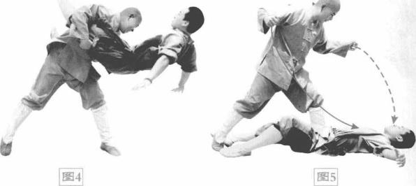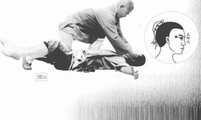 (4)松开双手使对方落地摔倒。旋即身体向前重心下移双拳变凤点拳猛击他头部两侧太阳穴将其制服。(图5、6)
