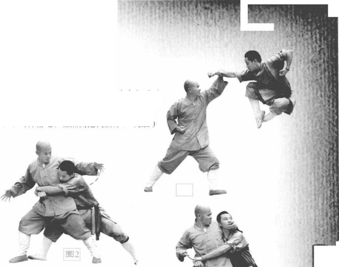 (1)对方身体腾空出右拳欲击打我头部我左臂向上顺势架挡。(图1)
