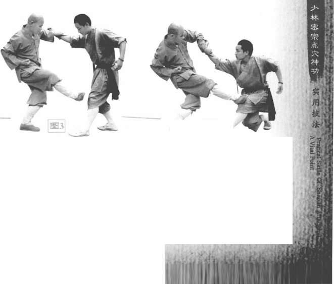 (3)我顺势左手紧紧抓握对方右手小臂同时抬右脚猛力踹击对方膝关节。