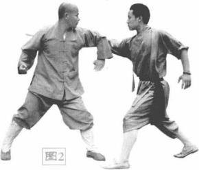 (2)同时重心上移左掌快速下拍震落其手中的木棍。(图2)