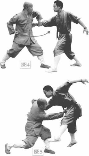 (3)紧接着左手反握他右手手腕扣住他腕部的要穴并猛力后拉。同时我出右拳拳心向上做掏心状猛力勾打对方胸部要穴或小腹。(图4、5)