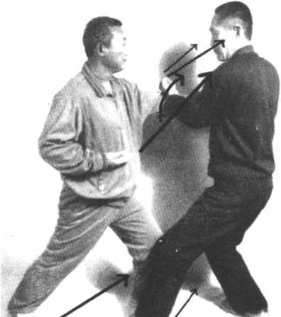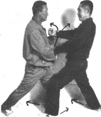 攻方起左脚,同时双手向两臂上颈耳护住两侧,落步时双手 推出直击守方前胸两肋。