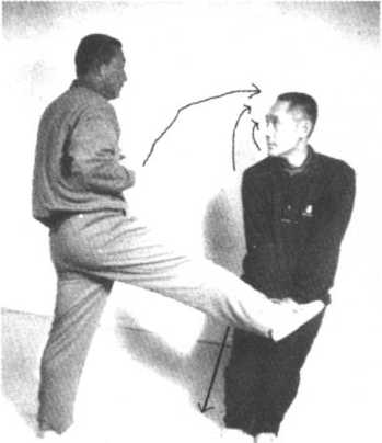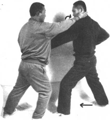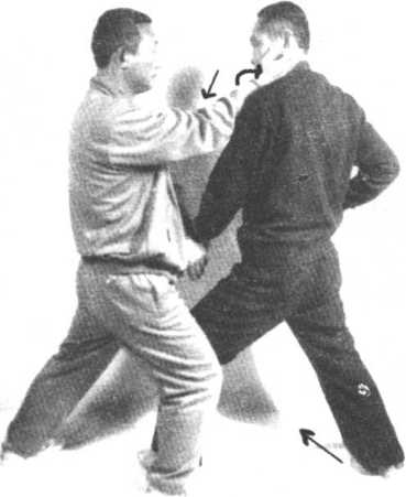 守方割手,同时右脚直踢攻方裆部,右腿落步时,右手变拳 或摔掌反盖攻方头顶百会穴。攻方右手护裆,右脚向后撤半步, 下蹲脚尖虚点地接叼守方右手,倒左手换把同时进左步,右手变 拳直击守方心窝,守方撤右步时左手抓住攻方右手腕。