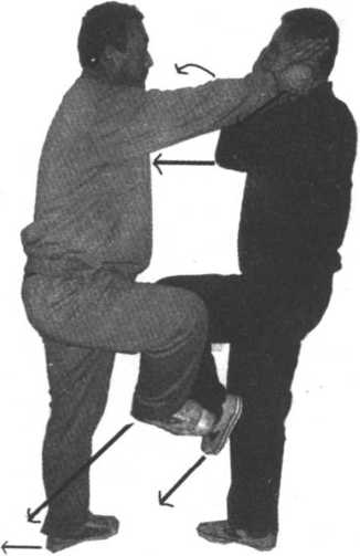 守方左手下拧,同时上右脚横踢攻方迎面骨,守方双手变拳 同时击攻方两耳太阳穴。