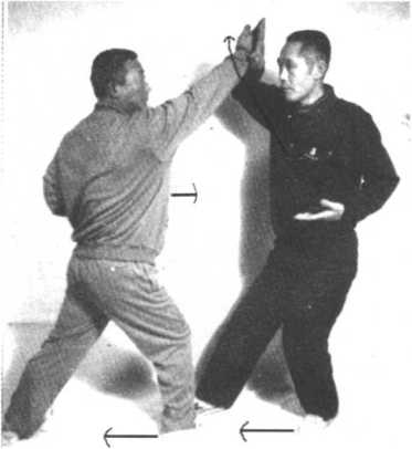 守方左手护胸将攻方双掌勾开,撤左步出右掌,直切攻方颈 部天窗穴。