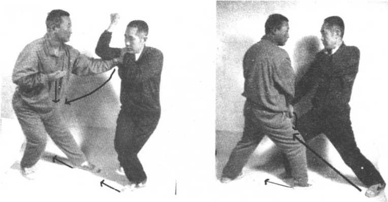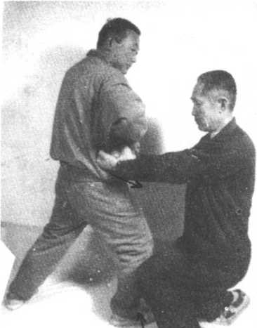 向后撤半步,下蹲脚尖虚点地接叼守方右手,倒左手换把同时进 左步,右手变拳直击守方心窝,守方撤右步时左手抓住攻方右手