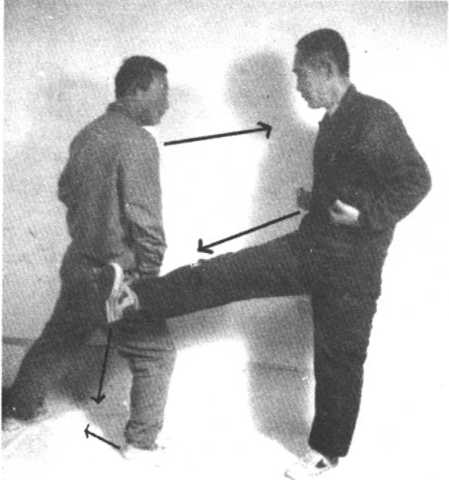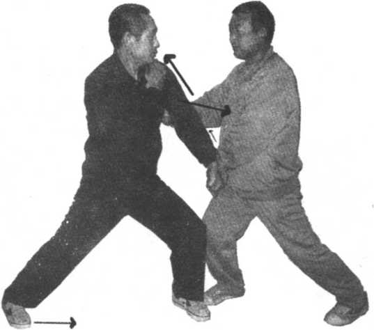 攻方起左腿横跺守方右腿伏兔穴,守方撤右步,左手反扣攻 方左脚腕部,攻方左手切开守方左手,守方撤左步,右手抓住攻 方肩井。