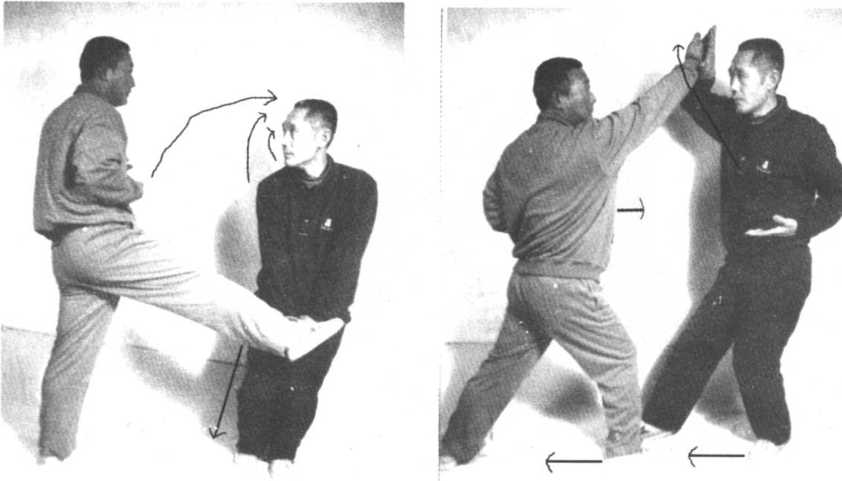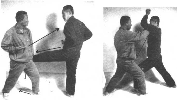 守方割手以一手破两手,同时右脚直踢攻方裆部,右腿落步 时,右手变拳或摔掌反盖攻方头顶百会穴,攻方右手护裆,右脚