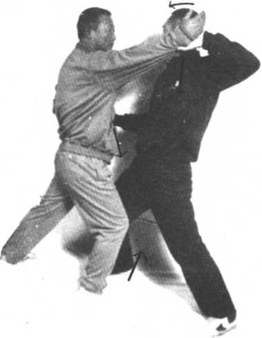 攻方扣住守方右手,左肘举起向下压打,直击守方小腹,守 方撤右手,同时左手护住腹部,右手直击攻方颈部天窗穴。