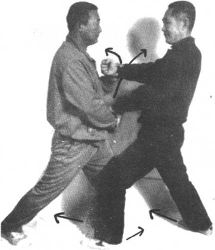 攻方双手交叉左右向上分开,封住守方打来拳,同时变拳掖 左步成坐盘式击守方右肋,守方用双手拨开攻方双手(名曰白鹤 亮翅)。