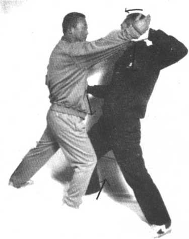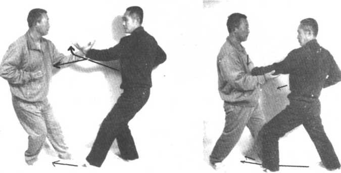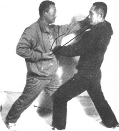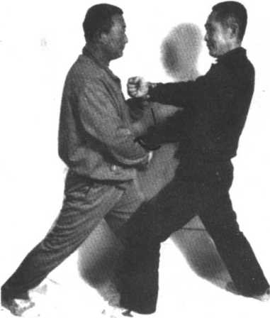 攻方左手捋叼守方右腕,右拳打守方胸窝,同时两脚不动向 里一拧,下坐变成坐盘(名玉环步)。守方双手抓攻方两肩,腰腹 向后一腾,连撤两步带攻方,攻方落步变成弓箭式。