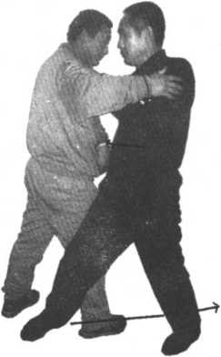 守方撤左步右手向上托住攻方左肘,攻方抓守方肘部进右 腿,反靠守方右腿,攻方右手直托守方小腹。
