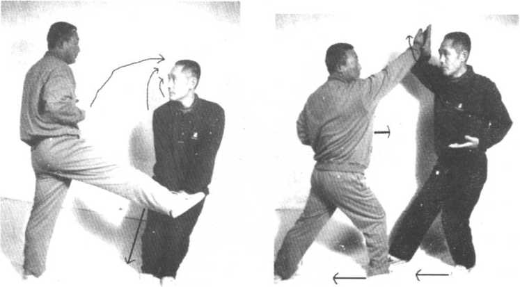 守方对割手,同时右脚直踢攻方裆部,右腿落步时,右手变. 拳或摔掌反盖攻方头顶百会穴,攻方右手护裆,右脚向后撤半 步,下蹲脚尖虚点地接叼守方右手,倒左手换把同时进左步,右 手变拳直击守方心窝,守方撤右步时左手抓住攻方右手腕。