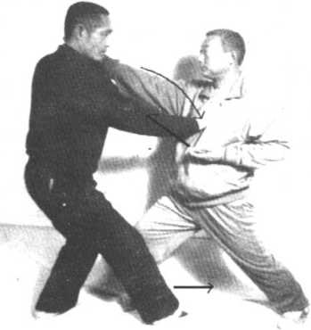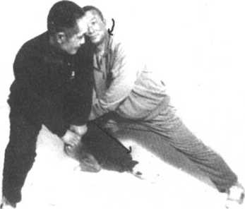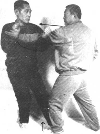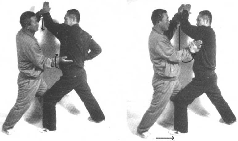 守方左手挑叼攻方左手,右掌击攻方左肋,攻方右手由下向 上挑叼攻方右手,同时双手下带,右腿下蹲左腿蹬成扑步。守方左手扣住攻方左脚腕,右肘用力下压攻方膝盖,攻方左 手横搬守方下颗,掖掌向外猛击,守方身体向右转,左手破攻方 手,右手击攻方颈部。攻方左手挂守方右手,上右步成虚步式,右手立掌击守方心 窝。守方破攻方手,撤右步出左掌击攻方颈部。攻方右手变拳贴肩,上左步成虚步式,同时左手变拳由下向 上挑守方左肘。守方向里下滚肘,左脚挂踢攻方左脚,右掌斜切守方颈后