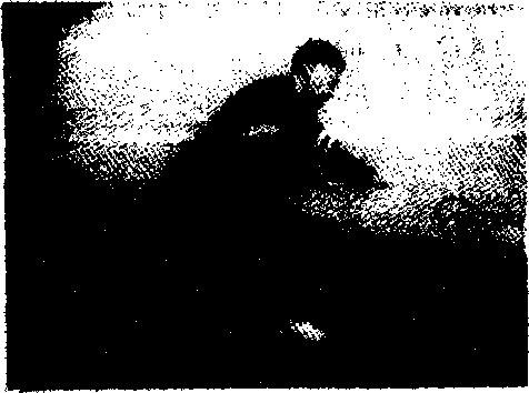 (1) 出左脚成左弓步左腿曲膝下蹲小腿与脚背之间成90度夹角两脚尖向前且平行两脚横向之间距离约一脚掌(如图4-7所示图中为两脚间的距离等于-脚掌)右脚膝关节挺直右小腿与大腿成-直线口
