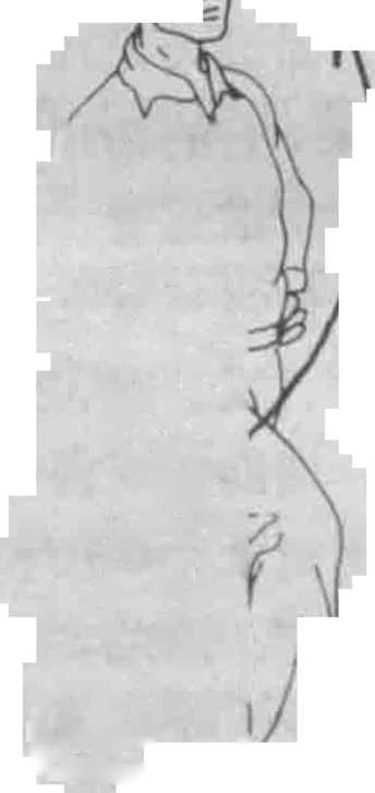 以腰为轴,带动右肩向右转 动90度,右手掌随势下行似“猫 洗脸”状,经左胸腹划弧至右腰 际,右肘向后方拉足成三角形,手 心向内成护腰状;同时左肩亦随 之向前,左手掌心向内、向上划 弧至右“太阳”穴处(图6)。
