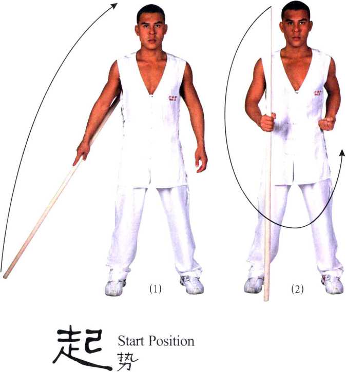 1. 双脚八字站立,比肩稍宽,身胸挺直。右手持棍,以拇指 和食指卡握棍身,其余三指自然弯曲,棍把触地;左臂自然垂于身 体左侧。左掌由体侧向体前推,胸前立掌,身稍前屈,头微低,敬 礼,再左手还原。