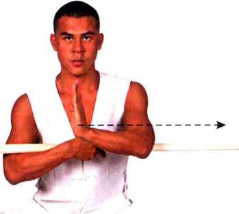 2. 接着右手握棍向左舞半花,左手接棍再脱棍,使棍竖立于 体右侧,棍梢向上;左手屈肘握拳,抱于腰间,身胸挺直。目视 前方。