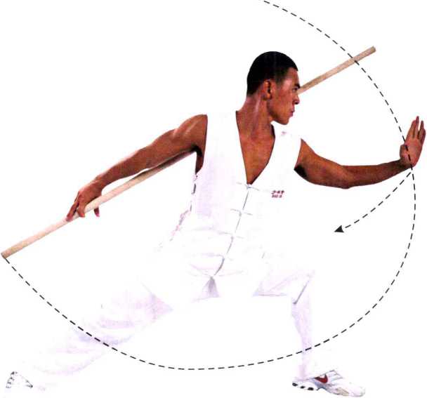 接上式,身体微右转,左脚尖点地,膝盖朝前使 左腿成弓形。右手持棍;左掌下