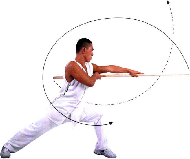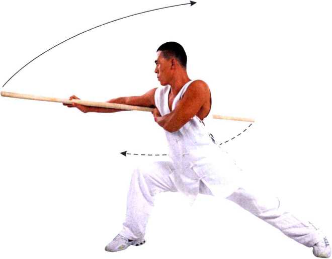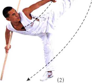 的力量要大,不至于因太过用 力横扫使棍脱手Step Forward And Turning Floor Sweep Kick身上步横扫上体左转180。,右脚微滑向左脚,两膝微屈。然后右脚向左 侧上步,体右转180。,接着右脚向左脚外侧上步,体左转90。, 再左脚向侧滑步,屈左膝下蹲成左弓步,体右转180。。同时两手 握棍随体转由右向左绕头云旋一周,然后由右向左横扫。目随棍转 视棍梢。[W 转身动作要迅速,横扫要拧腰发力,力达棍梢Back Kick