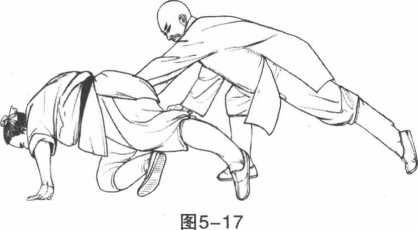 4动作不停左手松开敌方左腕按于其肩后侧随即双手用力将敌方向右撇倒在地。(图5-17)