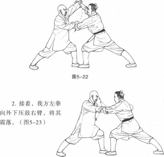 1敌方左进步右拳在上、左拳在下双拳同时攻击我方面部和胸部。我方迅疾抬起双臂左臂向外上方格挡敌右前臂内侧右拳向前下方按压敌方左前臂上侧阻截敌方攻势。(图5-22)3 敌方随即上体右转右拳反鞭拳击打我方头部。我方迅速用左手按压敌方左腕右手上抬接住敌方右腕。(图5-24)图5-244 动作不停我方右手抓住敌方右腕向右外侧旋拧同时左手抓握住敌方左腕旋拧双手将敌双臂向内侧上翻拧使敌前扑而被擒拿。(图5-25)图5-25