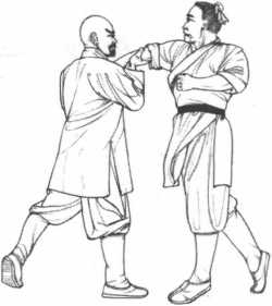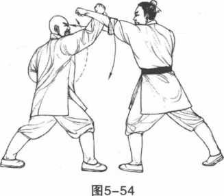 3动作不停我方左掌旋腕扣指拿住敌右腕向下旋拧同时右手将敌右肘向上托起右腿挺直伸立左脚踮起。以右手为支架左手下压将敌右臂擒拿如果用力过度可致敌臂断折。(图5-56)