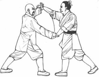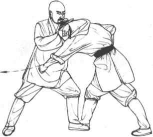 3 动作不停我方右脚向内移步左脚进步于敌方右脚内侧同时左手向前下缠抱住敌方头颈部右掌按住左手背助力将敌方头部抱贴于我左胸前进而控制住敌方。(图5-59)