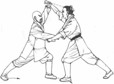 2 敌方紧接出右拳劈击我方头部。我方迅速举左臂向上架住敌右腕部下压上架将敌方两臂分开。(图5-58)