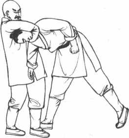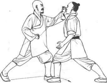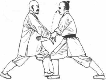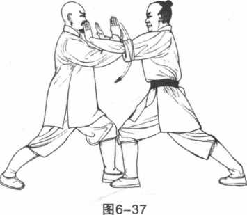 1 敌方左进步双掌同时向我方胸部推击。我方略后滑步之际双掌从下由敌方双臂中间穿出将其双臂向左右两侧分开。(图6-37)2 随即两掌贴敌方双臂下压用两掌棱贴敌两前臂外侧内合阻截敌方发力。(图6-38)3 动作不停我方双掌一发抖劲将敌方双臂向内一震左掌迅疾上翻成拳反背捶击打敌方面部重创其鼻梁。(图6-39)图6-394 紧接着我方右脚上一步同时右拳变掌前伸经敌方右肩上侧穿过环臂缠抱敌方头颈向上提劲控制敌方。(图6-40)