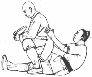 1 敌方从身后拦腰抱住我方。我方迅疾将两脚分开以免失衡随即仰面用头顶后侧撞击敌方面部。(图1-65)3 随即我方两腿屈膝下坐两手抱敌脚跟上提臀部狠坐敌右膝将其坐跌于地。(图1-67)