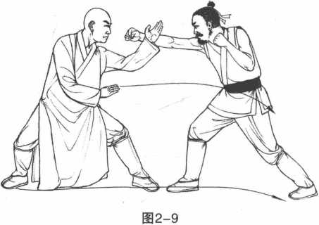 1敌方右进步右拳击打我方胸部。我方迅疾后滑步上挑左掌用掌背格阻敌方右前臂内侧。(图2-9)2 随即我方右脚向前方上一大步落于敌方中门成右弓步同时右掌搂住敌方左大腿后侧左肘顶击敌心口。(图2-10)3 动作不停我方右手搂住敌左大腿向上提起左肘前推将敌擒跌。(图2-11)