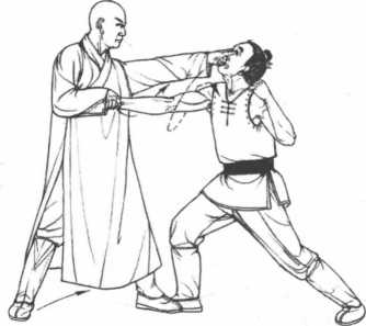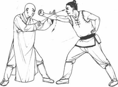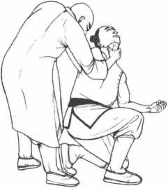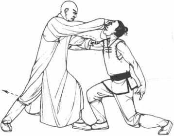 2 接着我方左掌贴住敌右臂向内下压右手成鹤嘴手(食中二指相并)直点敌方额头上侧神庭穴。
