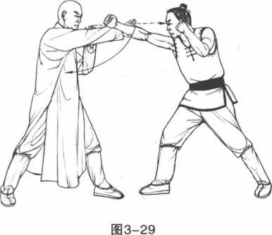 1 敌方右进步右拳击打我方面部。我方后滑步避敌拳锋芒之际右掌反拍敌右前臂外侧。(图3-29)