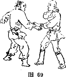 ①对方左反手抓我右手腕。(图66)② 我左手紧扣住对方左手背,两手往自己腹际拉贴,乘势右臂屈肘,以右小V?为力点下压其左臂,左手上提对方左 手,对方必感到剧疼。(图67) ①我有手腕被对方的右手紧握住。(图68)@我右手变拳屈肘,y腕力向对方丫_丨下拇指一》,突然 上举至左塯前,即解脱。同时,左r.下Hnt右手。(图G9)然后我右_进半步,以右拳背为力点,斜击或直击对 方之面部。(图70)