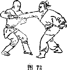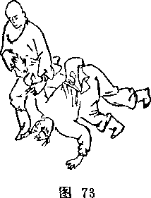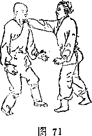 ① 对方右乎由左楼据我脖颈。(图71)@我腰向/f微拧,迮乎上托握K左肘,右手抓其右丁 腕?然后猛低头向左?下钻出。(图72)③ 随即我右手向回扳拧其右手腕,左手推压其肘。对方 必感痛疼而前伏被擒。(图73)(如我右手向后猛上扳,左手猛击其背部右侧,对方右肩即脱白)