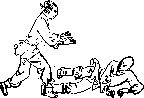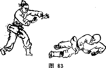 ??①我侧卧,对方企图扑捉我。(图83)??② 当对方进右脚时,我左脚尖上跷锁住对方右脚腕,同时,右腿速屈膝。(图8-0