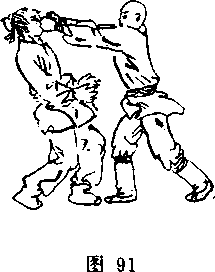 ① 前衣襟被对方双手抓住。(图86.)②我左手经其右臂上越过,抓其左手小指一侧扳拧,同 财,右手抓握对方左肘。(图87)H 87) ③随即我向左转体,双手合力扭压其左臂,对方双臂被拧压而感剧疼,即解脱。(图88)mmmm② 我双手握拳,双臂向上猛屈肘上举,即解脱。(图90>⑧随即我双拳向其面部直击。(图91>