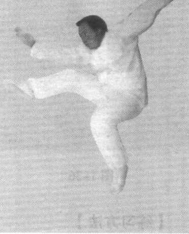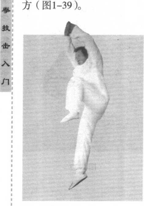 ! 身体正直朝前,双脚并步站立,眼向前平视。右脚快速向 :前上步助跑,左脚紧随其后向前上方摆起,右脚蹬地向上跳 :起,使身体腾空;同时,左腿屈膝提起,右脚向前上摆,右手 :背与左手心于头部上方相击拍(图1-38);接着,两臂分开, I:右手拍右脚面,左手成钩手向体侧直举,钩尖朝下。二目视前
